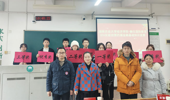 12月12日上午,湖南農(nóng)業(yè)大學(xué)經(jīng)濟(jì)學(xué)院聯(lián)合融仕國(guó)際教育集團(tuán)在十教南223舉行第四屆CFA金融基礎(chǔ)知識(shí)競(jìng)賽,經(jīng)濟(jì)學(xué)院副院長(zhǎng)吳玉宇教授,蔡洋萍副教授、向玉冰副教授、談?lì)楆?yáng)博士、呂建平博士出席并擔(dān)任評(píng)委,2023級(jí)經(jīng)濟(jì)學(xué)院全體CFA實(shí)驗(yàn)班學(xué)生參加比賽。