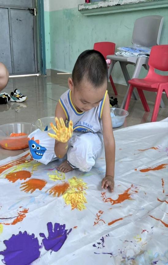 繪畫(huà)藝術(shù)治療是以繪畫(huà)藝術(shù)活動(dòng)為手段,對(duì)身心障礙者進(jìn)行輔助性治療的方法,幫助孤獨(dú)癥兒童穩(wěn)定情緒、抒發(fā)情感,改善認(rèn)知能力,建立社會(huì)意識(shí)和社會(huì)適應(yīng)性。2024年7月21日,“半夏鹿鳴”志愿服務(wù)隊(duì)與星星的孩子們共同進(jìn)行了一場(chǎng)“身體繪畫(huà)”——腳踩畫(huà)和手指畫(huà)。志愿者引導(dǎo)孩子們雙手雙腳沾上多彩顏料,在畫(huà)布上隨心繪制圖案。