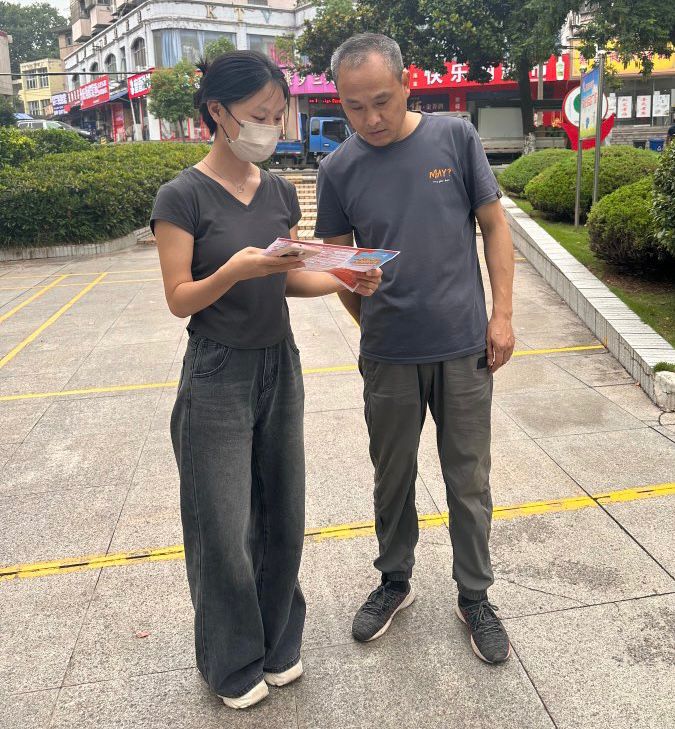 (圖為普法宣講團成員為1社區(qū)成員講解宣講冊,通訊員杜盈提供)