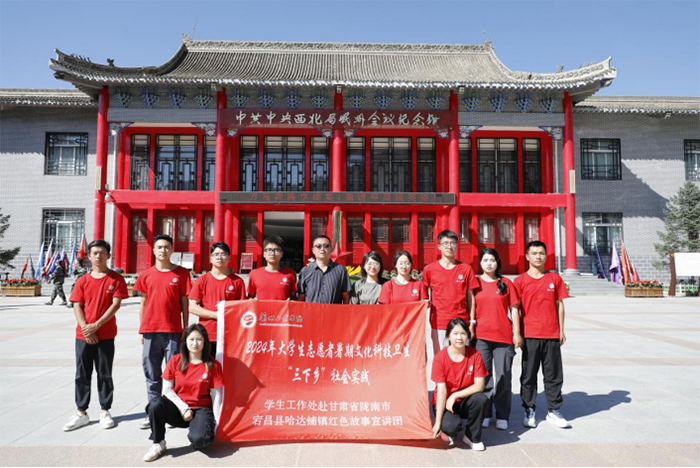(圖為實(shí)踐團(tuán)全體成員在岷州會(huì)議紀(jì)念館前合影留念/陳萬濤攝)