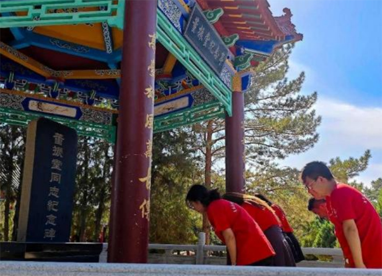 實(shí)踐團(tuán)成員身著紅色隊(duì)服,懷著崇敬的心情步入紀(jì)念館,在紀(jì)念館里,我們有幸和甘肅中醫(yī)藥大學(xué)的實(shí)踐團(tuán)進(jìn)行心得交流,從中我們深深地感受到了紅軍對中華民族做出的偉大貢獻(xiàn),被紅軍頑強(qiáng)的斗志和堅(jiān)定的信念所打動(dòng)。隨后施樂老師帶領(lǐng)大家依次參觀了紀(jì)念館的每一層展廳,深刻領(lǐng)悟了以“不怕犧牲、艱苦奮斗、頑強(qiáng)不屈、顧全大局”為核心的西路軍精神,進(jìn)一步堅(jiān)定了理想信念,提升了黨性修養(yǎng)。在紀(jì)念碑前,施樂老師帶領(lǐng)隊(duì)員們駐足緬懷,向英烈們鞠躬致敬。在烈士公墓前,隊(duì)員們認(rèn)真聆聽施樂老師講述紅五軍軍長董振堂、政治部主任楊克明等紅西路軍革命先烈壯烈犧牲、血沃河西的故事。