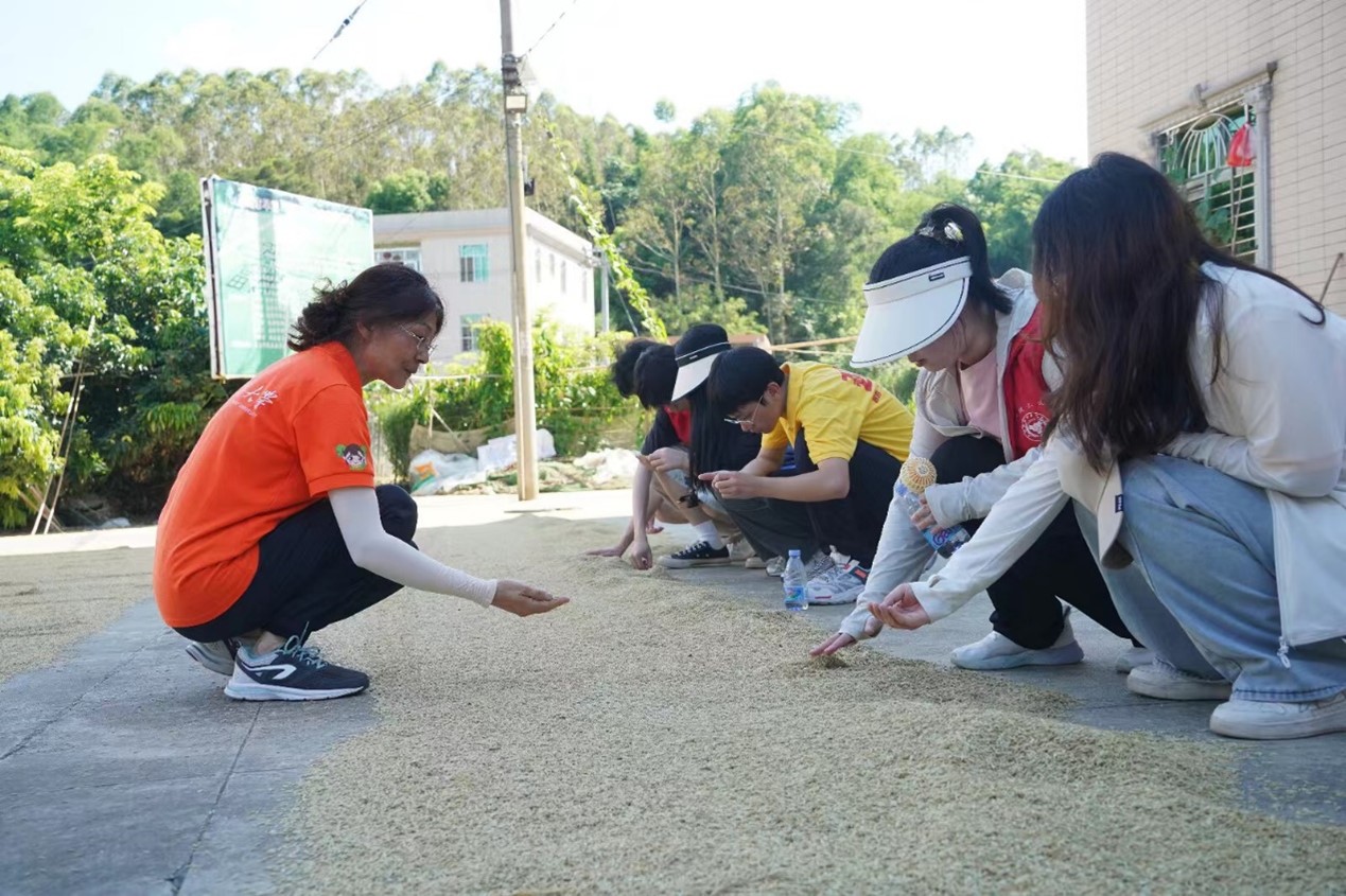馬翠蘭副教授與實(shí)踐隊(duì)員察看晾曬的早稻