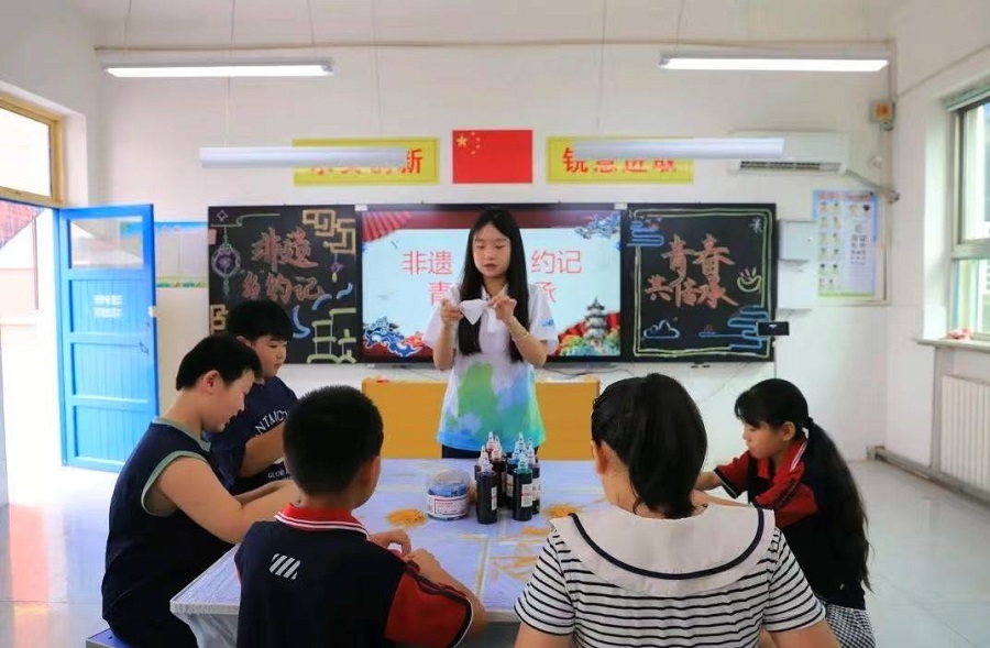 夏天的陽光灑在教室的窗欞上,扎染的藍、剪紙的紅、拓印的綠在孩子們手中流轉(zhuǎn)。為給鄉(xiāng)村兒童的暑期生活增添一抹傳統(tǒng)文化的色彩,質(zhì)量檢測與管理系暑期社會實踐團成員帶著精心準備的非遺技藝走進鄉(xiāng)村,用"沉浸式非遺課堂"為孩子們編織了一個充滿東方美學的仲夏夜之夢,開啟一段傳統(tǒng)文化奇旅。