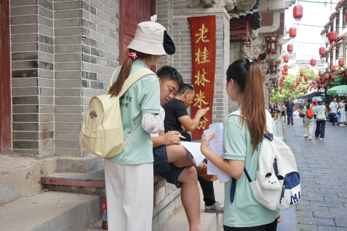 圖為團隊成員向游客發(fā)放調(diào)查問卷