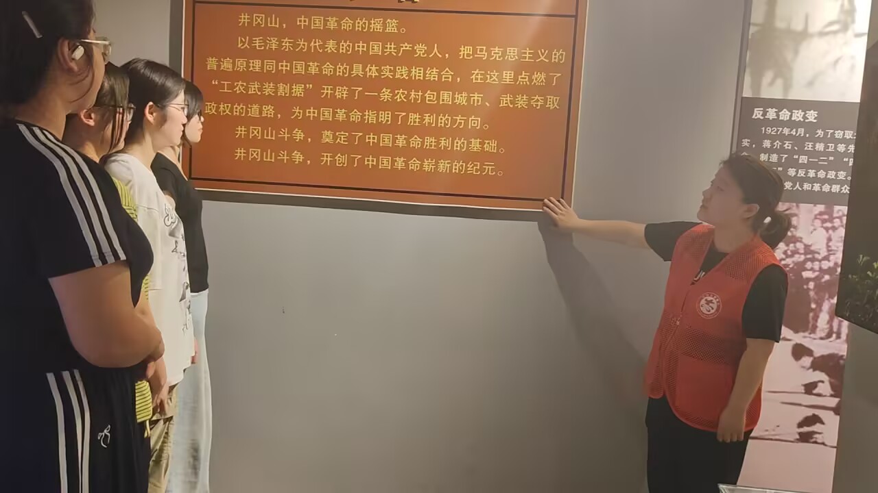 “大家看這幅圖,1927年秋收起義后,毛澤東同志率領(lǐng)工農(nóng)革命軍向井岡山進(jìn)軍,正是這條崎嶇的山路,走出了中國革命的新道路……”隊(duì)員劉同學(xué)站在“井岡山革命根據(jù)地創(chuàng)建”展區(qū)前,結(jié)合提前準(zhǔn)備的史料,向同伴們生動講述著革命先輩在井岡山的斗爭歷程。從“三灣改編”的歷史轉(zhuǎn)折到“朱毛會師”的振奮時刻,從“井岡山的星火”到“蘇區(qū)精神的傳承”,隊(duì)員們輪流接力,用青春話語解讀著“堅(jiān)定信念、艱苦奮斗、實(shí)事求是、敢闖新路、依靠群眾、勇于勝利”的井岡山精神內(nèi)涵。