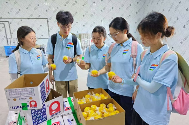 7月17日,實踐團的腳步踏向了充滿清香的檸檬產(chǎn)業(yè)鏈一線。首站抵達的檸檬凍庫內(nèi),低溫環(huán)境下的凍庫為八月即將采摘的檸檬做準(zhǔn)備,魏主任詳細(xì)介紹了從采摘后預(yù)冷、分級到冷鏈保鮮的全過程,讓實踐團成員直觀了解到如何靠科技給檸檬“保鮮鎖營養(yǎng)”。包裝套袋庫的自動化流水線吸引了大家的目光。從篩選、套袋到貼標(biāo),每一顆檸檬都經(jīng)過精細(xì)處理,既保障了運輸過程中的良好品相,也通過標(biāo)準(zhǔn)化包裝提升了產(chǎn)品附加值。成員們仔細(xì)觀察了套袋包裝并學(xué)習(xí)到了套袋包裝是為防止病蟲害的知識,深刻體會到產(chǎn)業(yè)鏈中“細(xì)節(jié)決定品質(zhì)”的真諦。