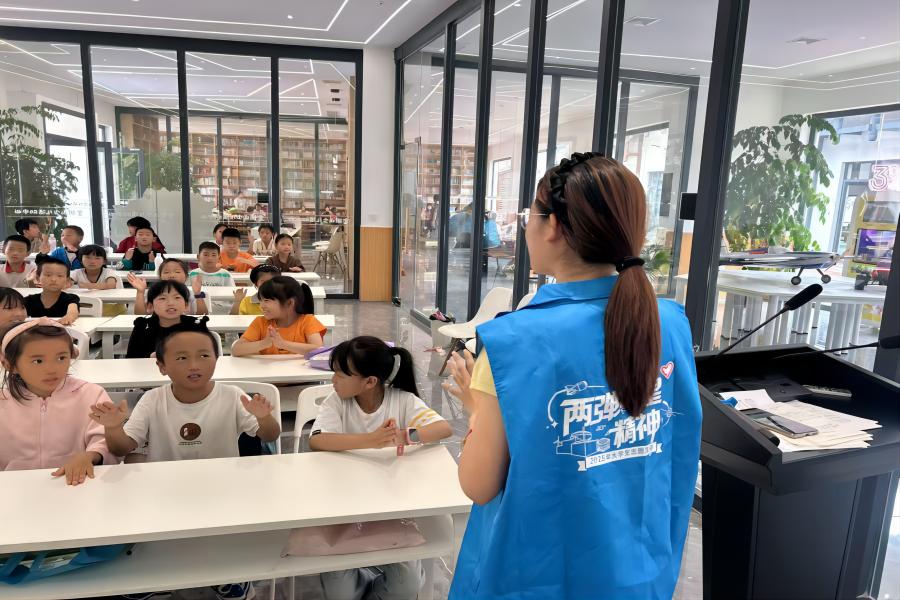 志愿者說到錢學(xué)森艱難歸國,同學(xué)們紛紛捏了一把汗;講到郭永懷舍命保護(hù)文獻(xiàn)材料時(shí),班級里又陷入沉默的嚴(yán)肅中,大家眼含熱淚致敬英雄。志愿者將同學(xué)們帶去那片遼闊而蒼茫的戈壁,在那里,科學(xué)家們用執(zhí)著與奉獻(xiàn)培育出科技之花。志愿者告訴孩子們,這些科學(xué)家絕不僅僅是書本上的名字,他們是活生生的榜樣,是懷揣著熾熱信念的愛國者,是民族記憶的璀璨星辰。