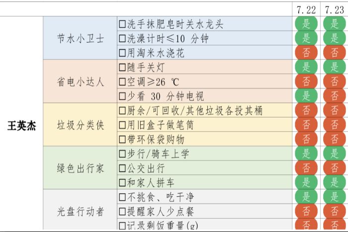 為推動(dòng)環(huán)保從“知識(shí)”到“行動(dòng)”落地,小分隊(duì)推出“環(huán)保打卡”活動(dòng),設(shè)計(jì)節(jié)水、節(jié)電、垃圾分類、綠色出行等打卡任務(wù)。學(xué)生們積極參與,洗手及時(shí)關(guān)龍頭、用淘米水澆花、步行上學(xué)、光盤行動(dòng)……一張張打卡表,記錄著日常環(huán)保實(shí)踐。