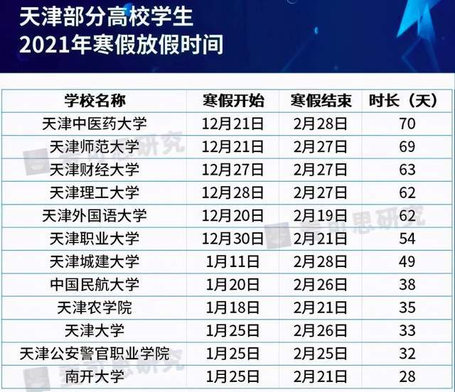 天津的高校放寒假時間總體來看是最早的。比如,天津師范、天津財經(jīng)、天津理工、天津外國語、天津中醫(yī)藥等多所大學(xué)放假時間都是從12月份便開始,持續(xù)超過2個月,這與近期天津的疫情反彈也有很大的關(guān)系。