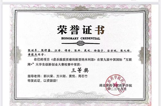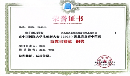 在2023年第十八屆挑戰(zhàn)杯中,團(tuán)隊(duì)成員成功克服一切困難,相互支持,助力項(xiàng)目完成,《“瘤”暗花明—虐殺腦膠質(zhì)瘤的新型納米利器》項(xiàng)目榮獲了湖北省省賽銅獎(jiǎng)。