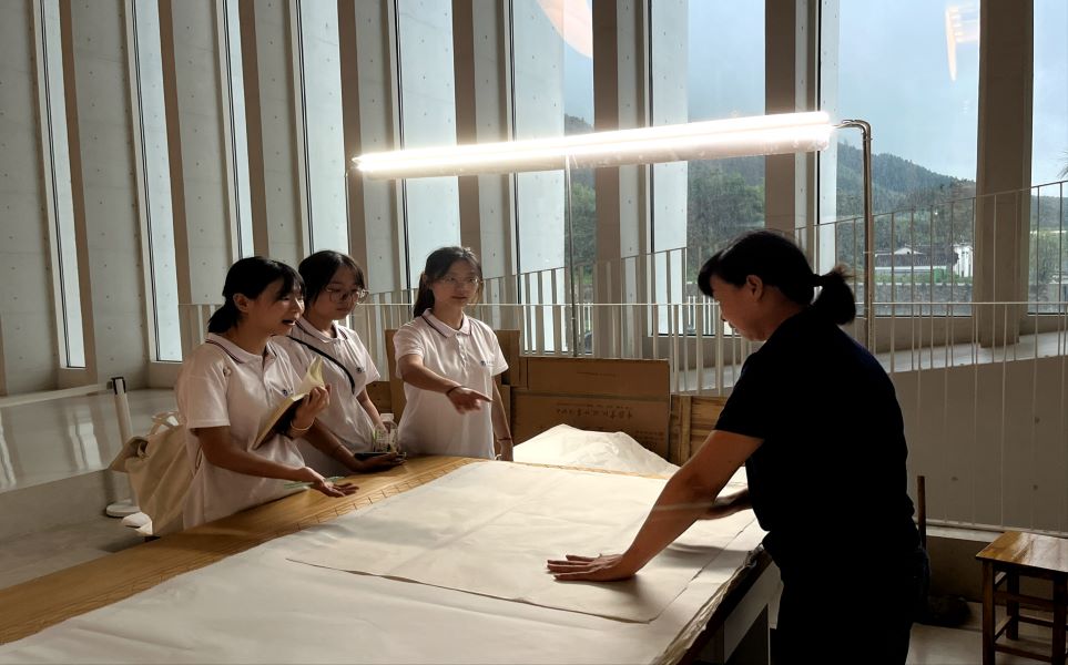 “宣紙制造不僅僅是一項技藝傳承,更加體現(xiàn)了嚴(yán)謹(jǐn)、一絲不茍、精益求精的工匠精神,每一步都凝聚著匠人的智慧與汗水。”在中國宣紙文化園內(nèi),講解員吳仕雨正為實踐隊員介紹宣紙制作流程。坐落在皖南涇縣烏溪境內(nèi)的中國宣紙文化園,主要由宣紙古作坊、文房四寶體驗園、宣紙及世界紙陳列館、書畫廊(含書畫家工作室)、文房四寶與書畫市場、古籍印刷與江南民俗園等七部分組成,隊員們依次參觀了文化園各個板塊。在老師傅指導(dǎo)下,實踐團(tuán)成員親身體驗了宣紙制作過程中的水撈、貼洪、抄撈等環(huán)節(jié),了解了宣紙制作選材、曬紙、質(zhì)檢等各個流程。大家深刻體會到宣紙制作不僅需要足夠耐心,同時還需要操作者眼、手、心巧妙地結(jié)合在一起,只有這樣“撈紙”流程才能如行云流水,一氣呵成。