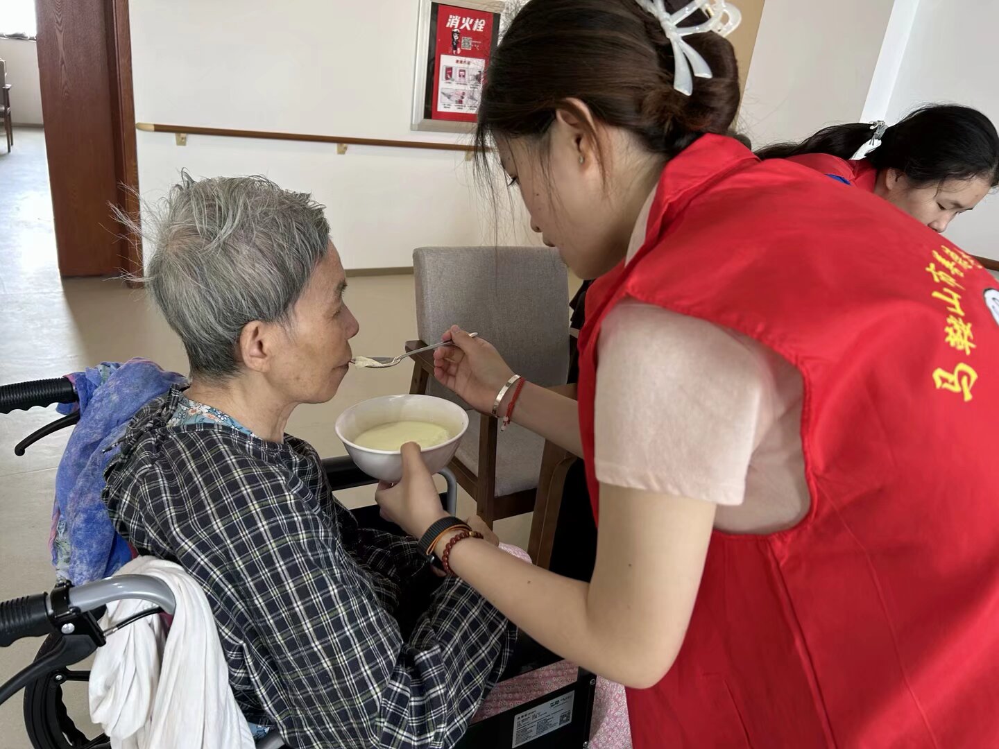 隊(duì)員們從日常場景切入,筑牢生活保障。接送電梯時(shí),攙扶老人穩(wěn)步進(jìn)出,全程守護(hù);對于進(jìn)行走動訓(xùn)練的老人,志愿者也耐心跟隨,以防老人摔倒。為失智老人喂飯時(shí),志愿者先調(diào)試溫度,再慢慢一勺一勺地送入老人口中,待老人吃完又細(xì)心為其擦去嘴邊的殘羹。測量血壓時(shí),規(guī)范纏繞袖帶、操作儀器,記錄數(shù)據(jù)后結(jié)合當(dāng)日狀態(tài),給予飲水、活動建議,將健康監(jiān)測融入服務(wù)細(xì)節(jié)。
