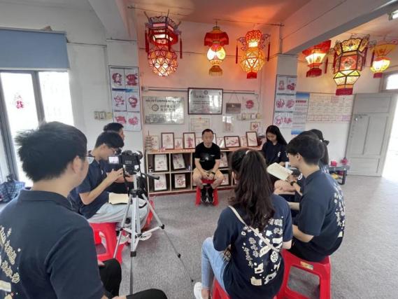 坐定之后,林偉忠緩緩向大家講述泉州花燈的歷史由來、制作精藝與現(xiàn)狀。實(shí)踐團(tuán)隊(duì)在豎耳聆聽的同時,手也不曾歇息,在林偉忠的指導(dǎo)下制作著簡易花燈;艏磳⒖⒐ぃ謧ブ乙沧龊昧私邮懿稍L的準(zhǔn)備。實(shí)踐團(tuán)隊(duì)了解到,花燈自古以來便以其制作手藝之精巧而聞名,在當(dāng)?shù)氐母黝愂止に嚻分谱鞔筚愔袑覍耀@獎。自被評為中國非物質(zhì)文化遺產(chǎn)以來也開始受到了當(dāng)?shù)厝罕姀V泛的關(guān)注,并榮登2022年春晚的舞臺。但是,花燈工藝依舊受地域化文化差異影響,在外地受眾較少,也缺乏宣傳手法。因此,創(chuàng)新的宣傳形式十分重要。交流過程中,林偉忠對實(shí)踐團(tuán)隊(duì)提出的以數(shù)字化賦能花燈等非遺宣傳的方案十分感興趣,并對實(shí)踐團(tuán)隊(duì)的思路表達(dá)了認(rèn)可。
