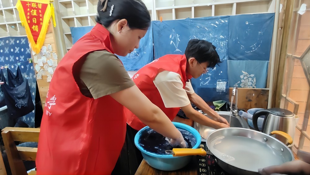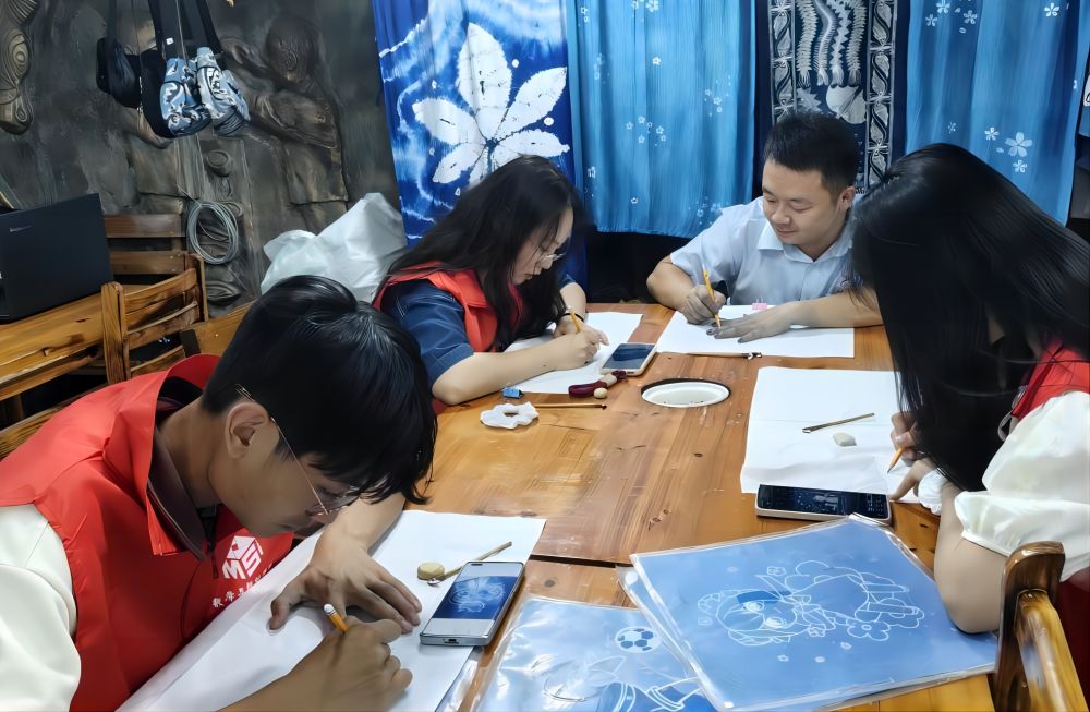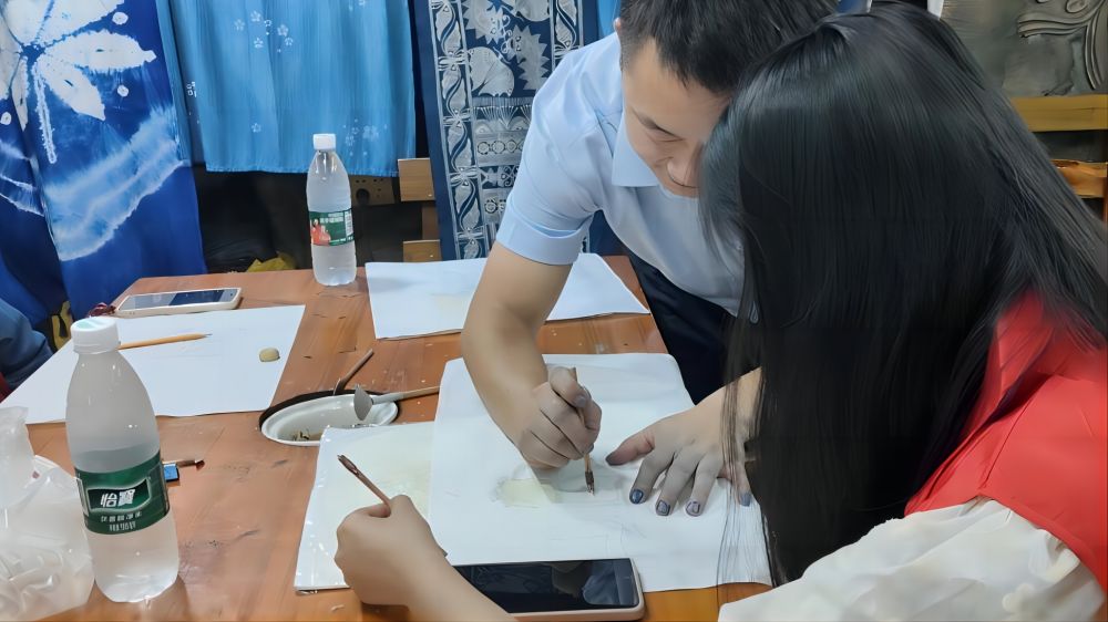 下午,實(shí)踐團(tuán)隊(duì)來到“苗族非遺蠟染體驗(yàn)中心”學(xué)習(xí)苗族蠟染技藝。苗族蠟染作為一項(xiàng)古老的藝術(shù),具有極高的藝術(shù)價(jià)值和觀賞性。隊(duì)員們虛心學(xué)習(xí)了鉛筆繪圖、蠟刀上蠟、浸水染色、平鋪氧化、煮沸脫蠟、清洗晾干等的蠟染技巧。在繪制過程中,隊(duì)員們還感受到了苗族蠟染的獨(dú)特魅力,每一筆每一劃都承載著深厚的歷史底蘊(yùn)。隨著學(xué)習(xí)的深入,隊(duì)員們的作品中逐漸顯現(xiàn)出進(jìn)步與個(gè)人風(fēng)格。在老師的指導(dǎo)下,隊(duì)友們不僅學(xué)會了技藝,更對苗族蠟染這一技藝產(chǎn)生了深深的敬意。