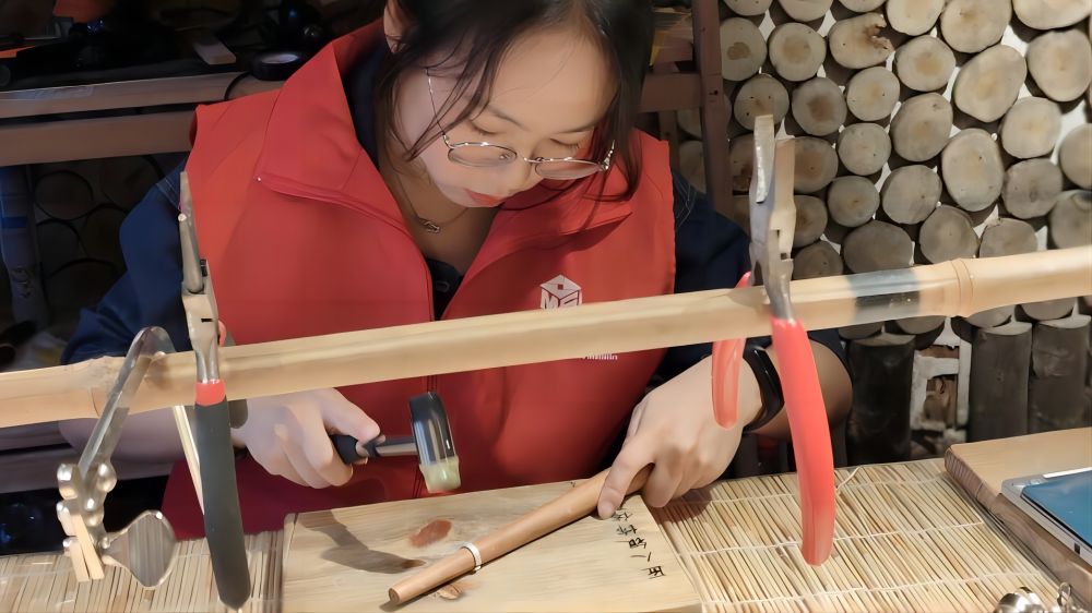 圖為團(tuán)隊(duì)成員敲打銀飾的過程