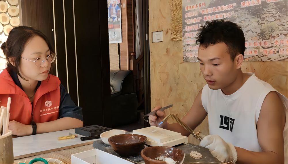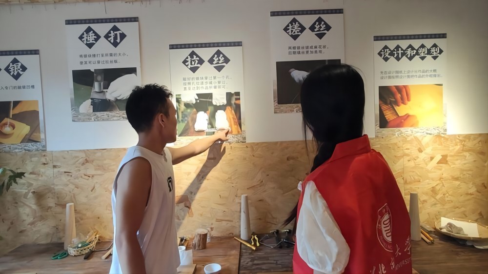 上午,團(tuán)隊(duì)成員在古巷體驗(yàn)和學(xué)習(xí)苗族銀飾鍛造工藝,在非遺傳承人龍虎太師傅的學(xué)徒阿青老師的指導(dǎo)下,學(xué)習(xí)敲打銀片、焊接銀飾。據(jù)阿青老師介紹:銀飾鍛造技藝是國家級非物質(zhì)文化遺產(chǎn)之一,也是苗族人民的藝術(shù)三寶之一,其以構(gòu)圖精巧、淳樸自然和技藝精湛而著稱;ńz工藝需要精湛的技藝,一只花絲鑲嵌的蝴蝶銀飾需要經(jīng)過融銀、捶打、拉絲、搓絲、設(shè)計(jì)、塑形、填絲、焊接、打磨、拋光等步驟,才制成最終的銀飾成品。在盛大的節(jié)日里,婦女們頭戴銀冠,項(xiàng)飾銀圈,腳套腳鏈,銀飾佩戴以多為美,以重為美。