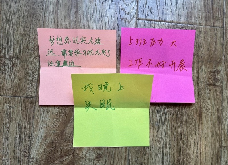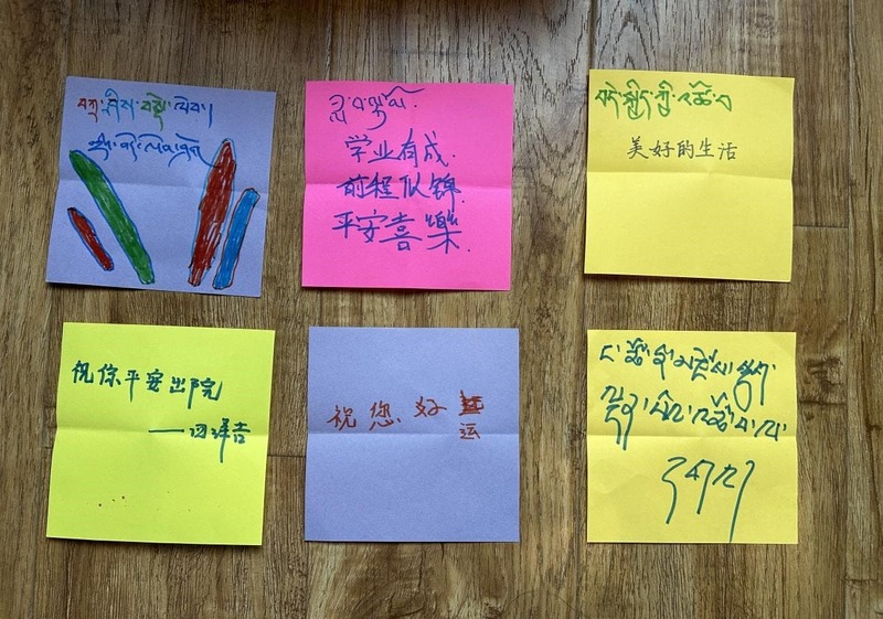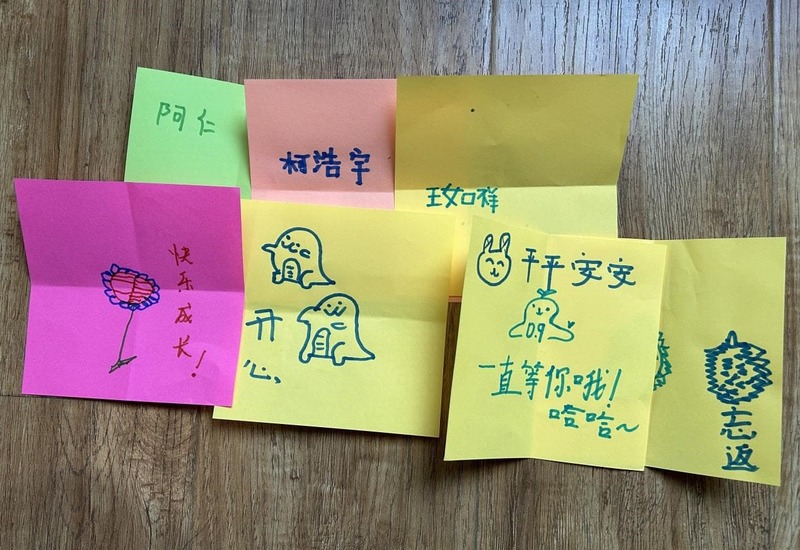 出乎意料的是,活動結(jié)束后整理“煩惱筒”時,我們發(fā)現(xiàn)筒內(nèi)只有寥寥幾張寫著煩惱的紙條。更多的則是對未來的祝愿、對病中親友的祝愿。還有不太會寫字的小孩子們用稚拙的筆畫留下自己的名字,或是用簡筆圖畫留下此刻的快樂。