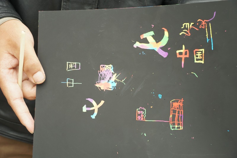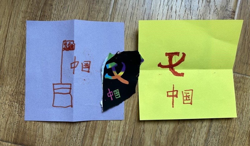 令我們感動的是,還有幾張紙條上畫著國旗與黨旗,一筆一劃、一絲不茍地寫下“中國”二字。