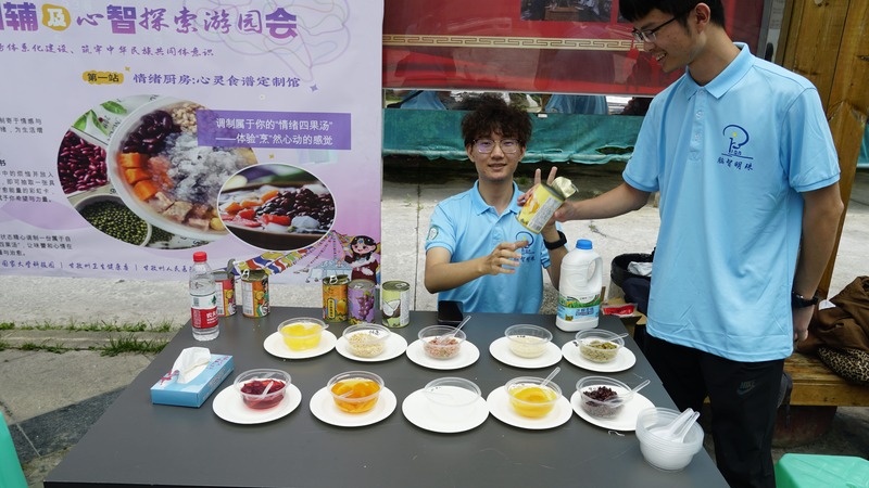 過程中,一位阿姨來到了我們的攤位。她并沒有參與,只是在一邊觀望著。實踐團成員注意到了她,主動邀請她來制作屬于自己的“情緒四果湯”。阿姨靦腆地擺手,但敵不過我們的熱情,還是上前拿起碗開始挑選材料。