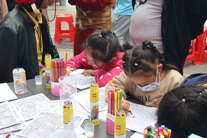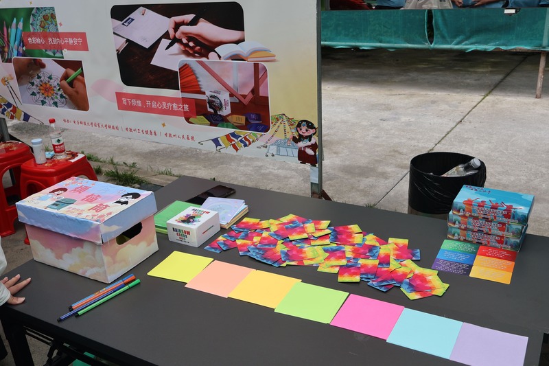 實踐團的成員們準(zhǔn)備了彩鉛、水彩筆與空白圖案卡紙,通過自由搭配色彩、填涂圖案,參與者們可以表達(dá)內(nèi)心的情感,在創(chuàng)作中找到內(nèi)心的平靜與安寧,從而更好地理解和處理自己以情緒,舒緩工作壓力。