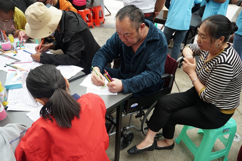 一整個下午,避雨長廊內(nèi)人滿為患,處處是歡聲笑語,熱鬧非凡。我們給他們送去的,不僅僅是物質(zhì)上的“情緒四果湯”、彩虹卡、彩畫、干花貼畫、香囊,更有精神上的慰藉。無論他們帶著什么樣的情緒走進我們的活動,在體驗與創(chuàng)造的過程中,他們都能暫時放下現(xiàn)實生活里的煩惱,享受內(nèi)心的快樂與平靜。