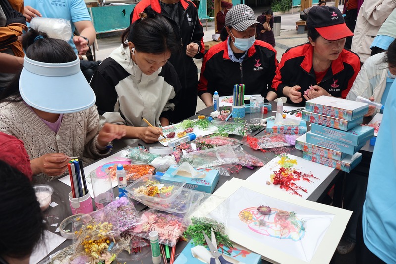 實踐團成員們買來了干花、圖案紙板、塑料膜、膠棒和水彩筆,參與者們可以根據(jù)個人喜好,自由選擇喜愛的干花,用膠棒將其粘貼在紙板之上。待所有花朵都被精心地粘好后,再用塑料膜覆蓋,便能使這幅“獨家定制”的干花圖永久留存。