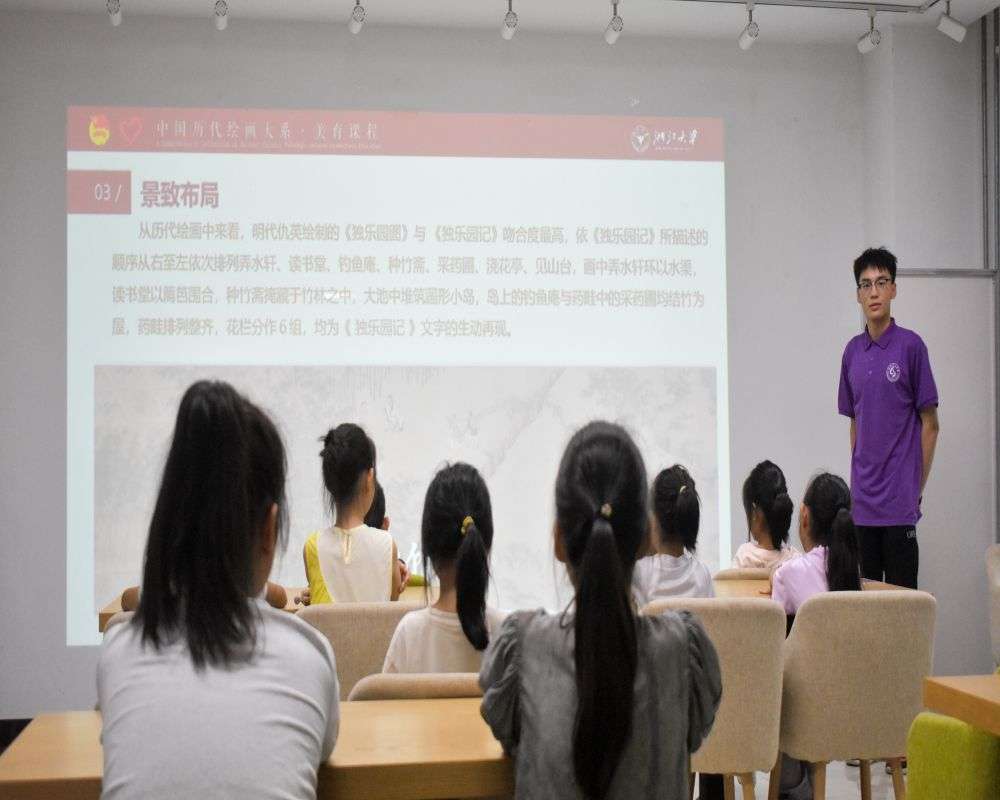 活動伊始,“繪心繪意”志愿宣講團隊長趙慕容同學(xué)作為主講,他以深厚的知識功底和生動的講解方式,帶領(lǐng)大家走進(jìn)中國園林藝術(shù)的奇妙世界。他首先講解并梳理了中國園林的歷史脈絡(luò),從先秦時期的宮苑到明清時期的私家園林,每一座園林都承載著時代的印記與文化的精髓。隨后,通過與孩子們的互動,趙慕容同學(xué)詳細(xì)闡釋了園林與園林繪畫之間的密切聯(lián)系。他表示,園林不僅是人們居住休憩的場所,更是文人墨客寄情山水、抒發(fā)情感的精神家園。而園林繪畫,則是對這一精神家園的藝術(shù)再現(xiàn),它以其獨特的審美視角和表現(xiàn)手法,將園林之美凝固于紙墨之間。