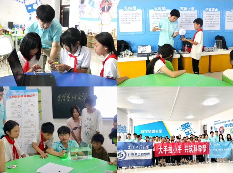 儀式后,計算機工程學(xué)院“指尖智薈”科技志愿服務(wù)團成員在太平實驗學(xué)校面向?qū)W校五、六年級三十余名學(xué)生開展了為期三天的科普課堂實踐活動;顒舆^程中,團隊成員們充分發(fā)揮專業(yè)優(yōu)勢,精心準(zhǔn)備,認(rèn)真?zhèn)湔n,向?qū)W生們生動講解和展示了包括“鹽水發(fā)電”、“花茶變色”、“飲水鳥”、“智能小車”、“時代的浪潮-人工智能”、“溫控風(fēng)扇”、“輝光球”、“光學(xué)系列實驗”、“磁的奧秘”、“科學(xué)家精神”、“航天精神”等近20個富有趣味性的科學(xué)小實驗和科學(xué)理論宣講課程,并且聯(lián)系實際,用淺顯易懂的方式幫助學(xué)生們了解和掌握實驗背后蘊含的熱力學(xué)、鏡面反射、AI等科學(xué)知識。整個過程課堂氣氛熱烈活躍,學(xué)生們聚精會神,積極參與。成員們也積極指導(dǎo)學(xué)生們實際動手操作體驗科學(xué)小實驗,從原理、實驗過程等各個角度充分為學(xué)生解疑答惑,引導(dǎo)學(xué)生在“做”中學(xué),充分感受科學(xué)魅力,激發(fā)學(xué)生熱愛科學(xué)、參與科普的熱情和興趣。