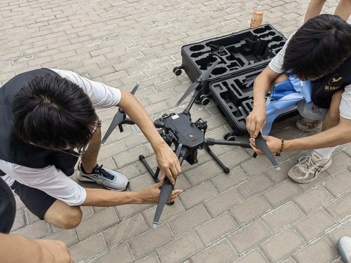 在隊長朱志毅的帶領(lǐng)下,實踐團一行人開始了檢測。團隊成員首先在實驗區(qū)域設(shè)置采樣點, 采集水樣, 經(jīng)實驗室檢測得出實驗所需參數(shù)值。然后利用無人機搭載多光譜傳感器獲取研究區(qū)域的多光譜圖像,借助無人機系統(tǒng)搭載的多光譜成像儀生成多光譜圖像,直觀全面地監(jiān)測地表水環(huán)境質(zhì)量狀況,提供水質(zhì)富營養(yǎng)化、水華、水體透明度、懸浮物排污口污染狀況等信息。同時后臺可實時拼接無人機影像,形成直觀的正射圖,便于發(fā)現(xiàn)異常情況和排污。然后,實踐團成員對所獲取的圖像進行輻射校正處理得到光譜反射率數(shù)據(jù).再將獲取的區(qū)域光譜數(shù)據(jù)與水質(zhì)要素(TP、SS、TUB)實測數(shù)據(jù)進行Pearson相關(guān)性分析, 選擇相關(guān)性達標的參數(shù)通過線性函數(shù)、指數(shù)函數(shù)、多項式函數(shù)及冪函數(shù)的擬合, 構(gòu)建反演模型, 使模型可以將獲取的拍攝圖片轉(zhuǎn)換成水質(zhì)要素參數(shù)值(TP、SS、TUB).最后根據(jù)獲取的多光譜圖像及建立的反演模型, 制作研究區(qū)域的水質(zhì)要素數(shù)值分圖。