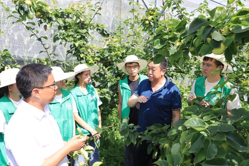 深入梨園,劉維建介紹著自己種植的梨樹(shù)品種,例如長(zhǎng)把黃花梨、翠冠梨、早白蜜梨、黃金梨等。“每棵梨樹(shù)可產(chǎn)60—80斤梨果,每畝可以栽種梨樹(shù)110株,每畝純收入可達(dá)13000元,”劉維建說(shuō)道,“今年由于降雨量增多,在金川縣本來(lái)不需要套袋的翠冠梨,果實(shí)表面形成了嚴(yán)重的銹斑,對(duì)果實(shí)的銷(xiāo)售產(chǎn)生了一定的影響。”團(tuán)隊(duì)成員在觀(guān)察梨樹(shù)時(shí)也發(fā)現(xiàn)了這個(gè)問(wèn)題,對(duì)此,實(shí)踐團(tuán)成員給劉維建提出了建議:可采用二次套袋技術(shù),并科學(xué)合理使用殺菌劑對(duì)梨果銹進(jìn)行防治。