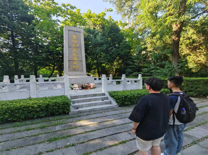 隨后,實(shí)踐隊(duì)拾級而上,來到位于南京大學(xué)校內(nèi)的革命烈士紀(jì)念碑,是為紀(jì)念該校革命烈士而建。實(shí)踐隊(duì)成員們莊嚴(yán)肅穆,面色凝重地站在革命烈士紀(jì)念塔下,進(jìn)行了30秒的默哀,用無言的行動(dòng)寄托對革命先輩的哀思以及對革命精神的銘記!雕塑無聲,烈士無言。逝去的英烈永遠(yuǎn)逝去,但革命的精神永垂不朽。這不禁讓隊(duì)員們更加認(rèn)識到本次國防安全教育活動(dòng)的重要性和必要性。