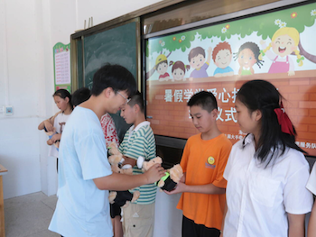 儀式當天,現(xiàn)場氣氛熱烈而溫馨。學生們用他們稚嫩的小手,相互贈送著自己精心準備的禮物,每一張笑臉都洋溢著純真的喜悅和對友情的珍視。而志愿者們也在這個特別的時刻,將滿載著愛與祝福的禮物一一送到學生們的手中;ベ浂Y物后志愿者和學生們一起通過擊鼓傳花、你劃我猜、傳聲筒等趣味小游戲,以及集體合唱、show time舞蹈展示和朗誦等時光重溫環(huán)節(jié)。稚嫩的童聲如同夏日的清泉,滋潤了每個人的心田,展現(xiàn)了無限的可能與希望。志愿者們與學生們攜手制作指紋畫作、寫寄語留念時,氣氛達到高潮。他們分享支教過程中的點點滴滴,有歡笑、有淚水、有挑戰(zhàn)、有收獲。崇陽星光志愿服務隊的成員們也在這期間與學生們共同回顧起這段難忘的時光。這些回憶如同指紋一般,深深地烙印在每個人的心中,成為他們人生中寶貴的財富。