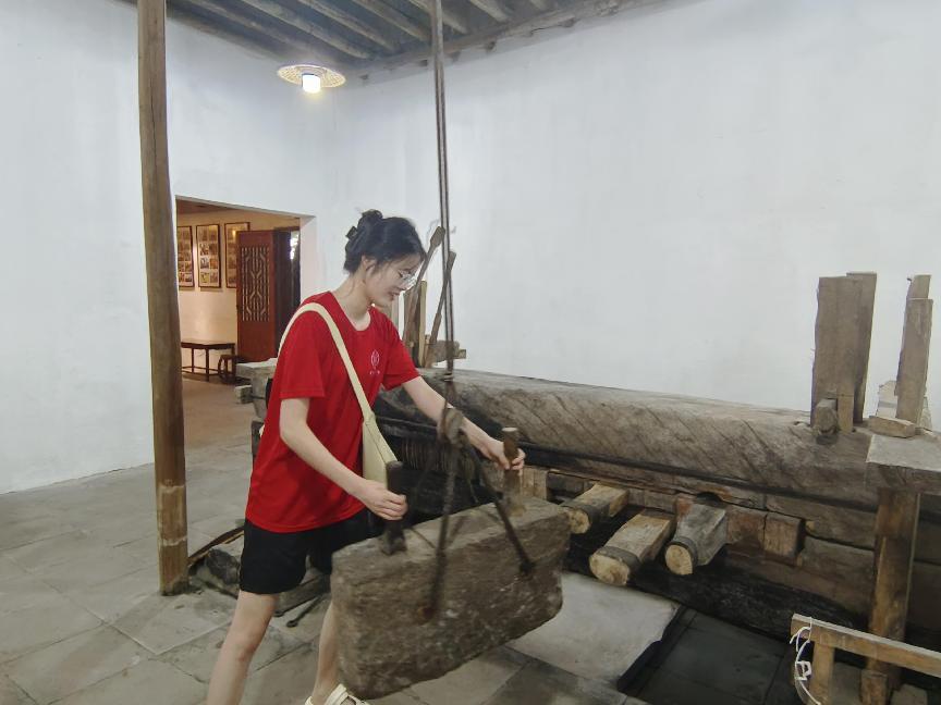 7月12日,實踐團成員們對益然香木榨文化產(chǎn)業(yè)園進行了深入考察。在園區(qū)負責人的陪同下,成員們參觀了油菜博物館,對油菜生長原理及菜籽油加工有了深刻全面的認識。隨后,成員們進一步探訪了歷史悠久的油坊,見證了非遺傳承師傅們精湛的手藝。他們運用重達近五百斤的鐵杵,以穩(wěn)健的節(jié)奏敲擊木楔,展現(xiàn)了力與美的和諧統(tǒng)一。在師傅們精準掌控下,敲擊聲此起彼伏。成員們體驗了鐵杵沖榨,感受非遺工藝魅力,同時體會傳承艱辛。