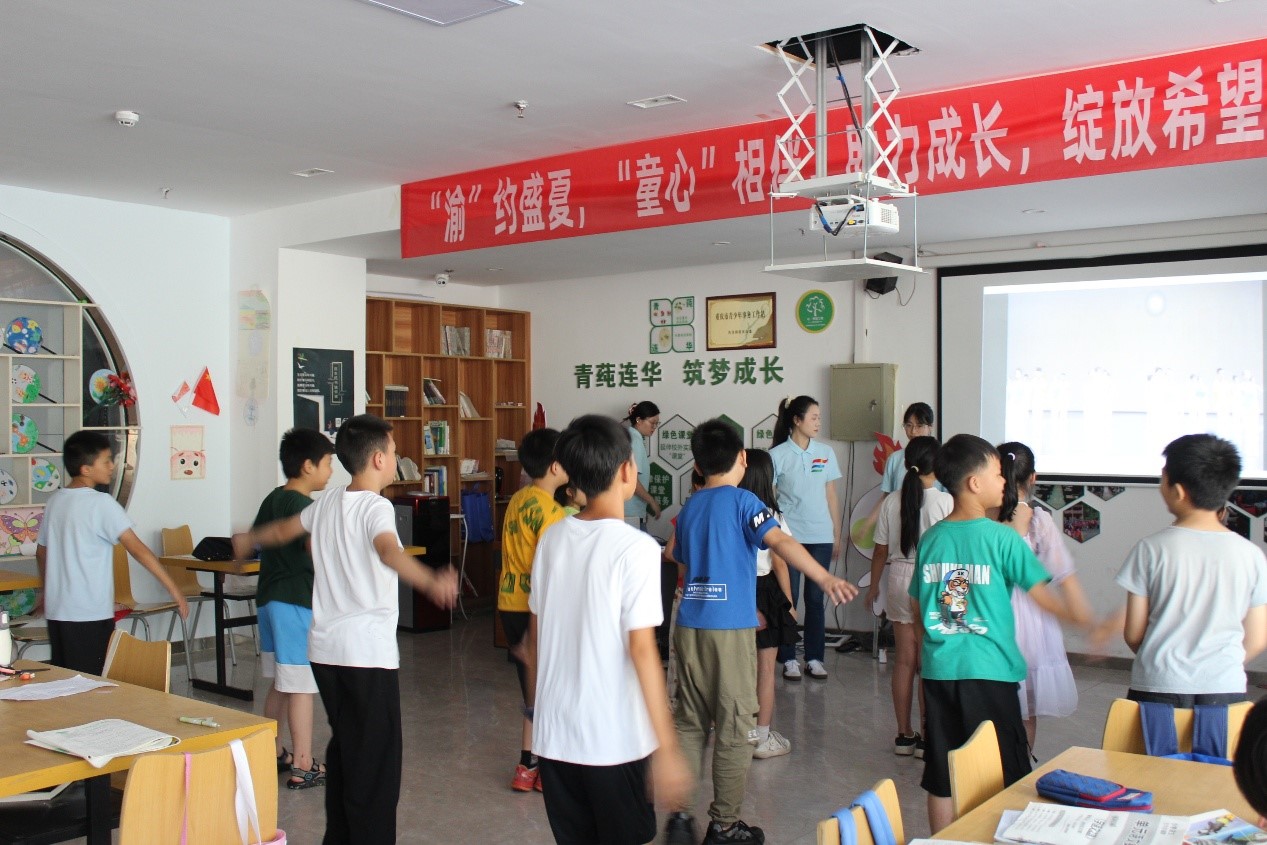 圖為宣講團(tuán)成員們與孩子們一起展示擺手舞舞蹈成果 陳書(shū)雅 供圖