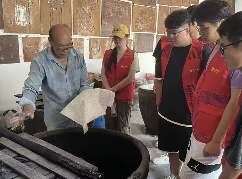 印染程序重重研學(xué)氛圍濃濃 接著,團(tuán)隊(duì)成員跟隨王如坤先生來(lái)到染坊,王如坤先生向成員們口傳身授印染的步驟,團(tuán)隊(duì)成員用心傾聽(tīng)并親自體驗(yàn)。團(tuán)隊(duì)成員耐心聽(tīng)取王如坤先生講述染布的細(xì)節(jié)要點(diǎn),初步掌握印染步驟,王如坤先生也細(xì)心幫助大家補(bǔ)全印染知識(shí)盲區(qū),團(tuán)隊(duì)成員受益匪淺。在藍(lán)印花布的精心制作過(guò)程中,那些經(jīng)驗(yàn)豐富的工匠們憑借著自身的智慧以及非凡的耐心,將源遠(yuǎn)流長(zhǎng)的傳統(tǒng)文化以一種更為生動(dòng)鮮活、饒有趣味和極具創(chuàng)意的獨(dú)特方式精彩地呈現(xiàn)了出來(lái),令人深深地感受到了文化所蘊(yùn)含的強(qiáng)大力量和蓬勃的生命力。團(tuán)隊(duì)成員不禁由衷地感慨道:“唯有親身體驗(yàn)過(guò)后,才能夠真切地體會(huì)到印染過(guò)程是如此的漫長(zhǎng),所涉及的步驟是如此之繁多,我們深深地感受到匠人們傳承非遺手藝的艱辛與不易。”