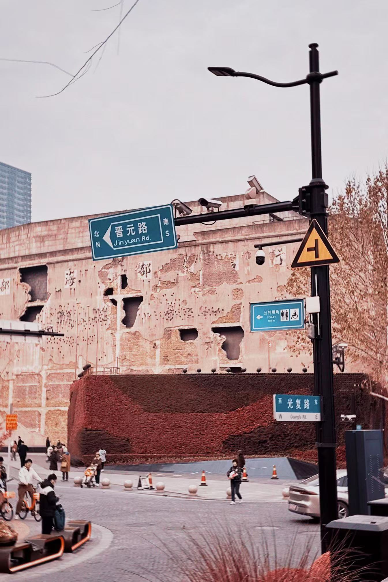 早上9點(diǎn),實(shí)踐團(tuán)隊(duì)抵達(dá)四行倉(cāng)庫(kù)。這座充滿(mǎn)歷史滄桑感的建筑,外墻保留著當(dāng)年戰(zhàn)火洗禮的斑駁痕跡,墻體上的彈痕累累,仿佛在訴說(shuō)著那段悲壯的歷史。倉(cāng)庫(kù)大門(mén)緊閉,上方懸掛著“八百壯士英勇抗敵紀(jì)念地”的牌子,讓人肅然起敬。