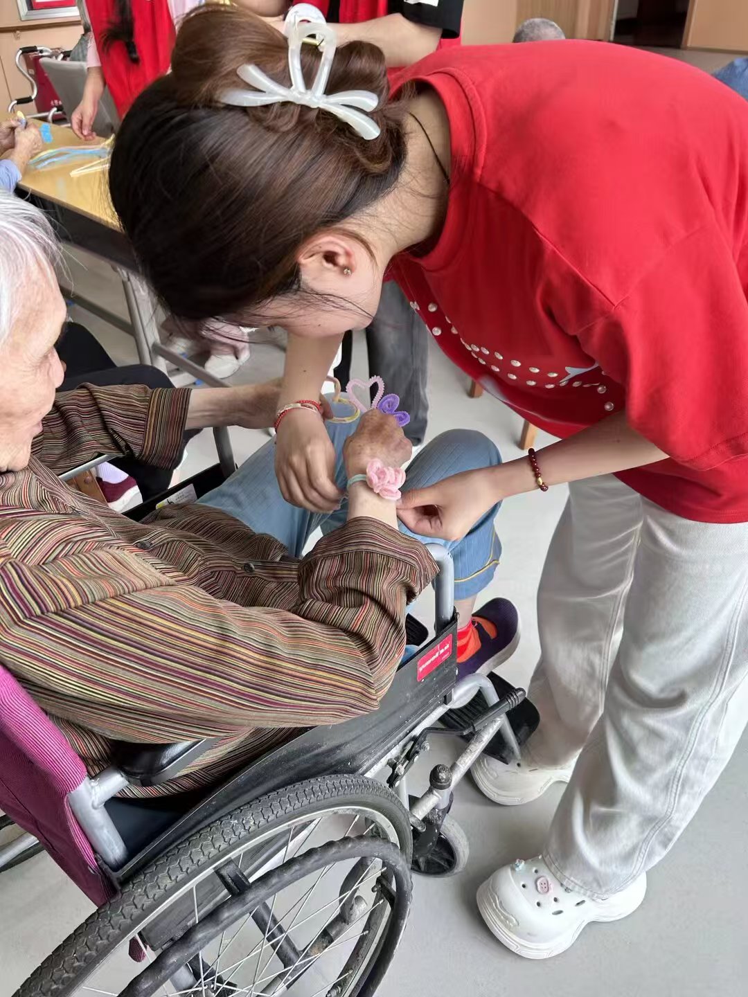 圖為志愿者給奶奶佩戴手工手環(huán)。通訊員丁潔 供圖
