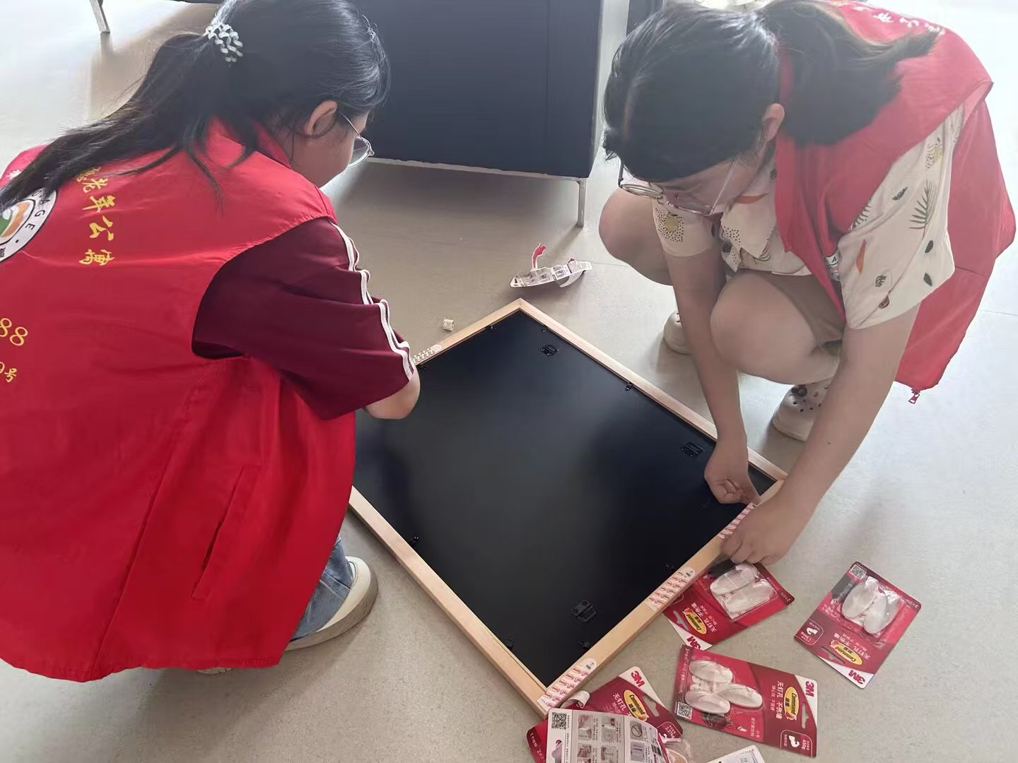 圖為志愿者幫助粘貼畫框。通訊員郭弋歌供圖