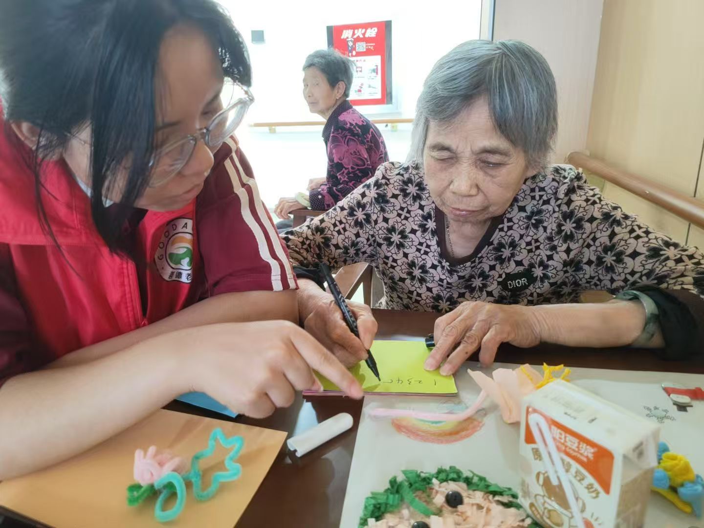 活動期間,志愿者們針對失智老人精心制作了數(shù)字卡片和單詞卡片,希望通過這些簡單的學(xué)習(xí)工具,幫助老人們鍛煉思維能力,豐富日常精神生活 。每天上午,志愿者們與老人一同開展泥塑活動,現(xiàn)場充滿歡聲笑語。一雙雙年輕的手與布滿皺紋的手共同塑造著泥偶,每一個作品都承載著跨越年齡的溫暖情誼。