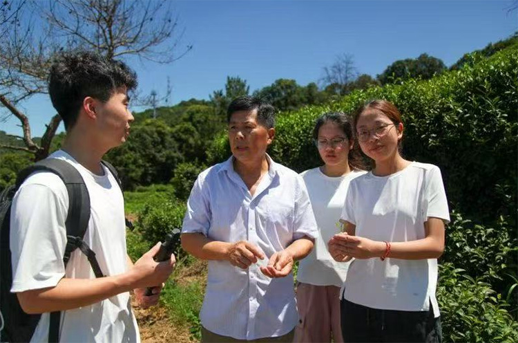 在吳大師的帶領(lǐng)下,實(shí)踐隊(duì)步入他精心照料的茶園。滿目蒼翠間,吳大師介紹到杭州市農(nóng)業(yè)科學(xué)研究所試驗(yàn)基地緊鄰茶園。這一地理之便,象征著西湖龍井保護(hù)傳承中科學(xué)與傳統(tǒng)的并軌而行——研究所以科技力量持續(xù)優(yōu)化茶樹品種與種植技術(shù),而如吳金龍這樣的匠人,則以爐火純青的手工技藝賦予茶葉靈魂。傳統(tǒng)匠心與現(xiàn)代科研在此處交匯,共同守護(hù)著西湖龍井的卓越品質(zhì)與文化根脈。