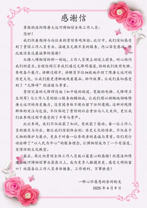 隋唐大運河文化博物館內(nèi)場安保主管王偉表示:“博物館一層、二層都陳列有絲路相關(guān)文物,包括胡人俑、瓷器等。此外,博物館還會不定期舉辦一些與絲路相關(guān)的臨時特展。” 在訪談中,王偉動情講述了一個溫暖故事:今年牡丹文化節(jié)期間,一群來自登封的輪椅使用者專程致信博物館,感謝無障礙設(shè)施和工作人員的貼心服務(wù)讓他們完整參觀了展覽。“那封信里說,通過我們的講解,他理解了大運河的歷史意義,更感受到文物工作人員的真誠與尊重。”王偉的話讓隊員們深刻體會到,文化工作不僅是知識的傳遞,更是人文關(guān)懷的實踐。
