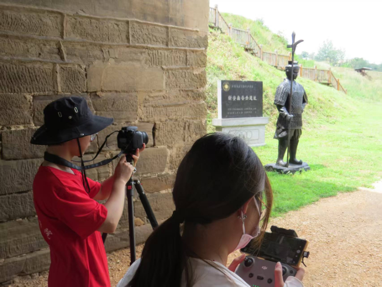 (實(shí)踐隊(duì)成員使用相機(jī)和無人機(jī)對函谷關(guān)遺址進(jìn)行圖像采集)