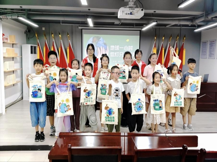 圖為志愿者與小朋友共同展示帆布包畫作 左旖夢供圖