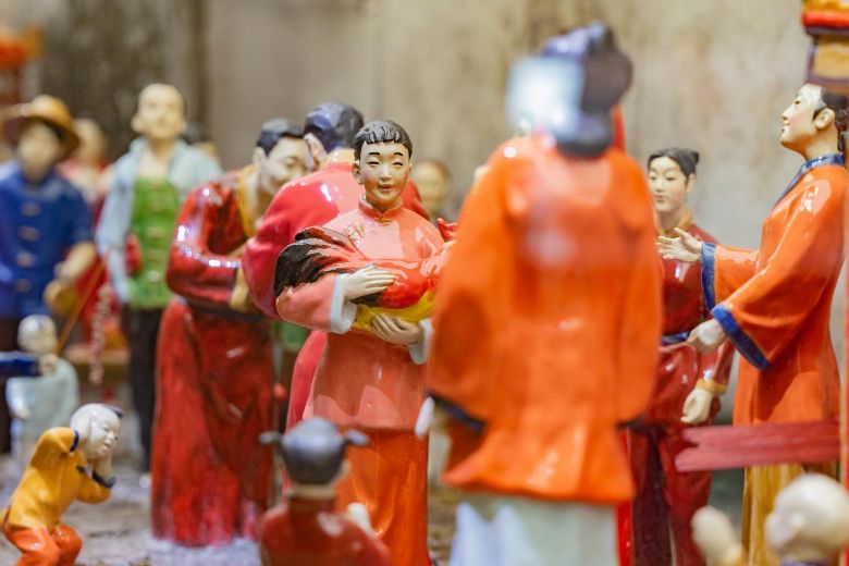 三、漁海華章:喚醒文化基因的非遺技藝,連接古今對話的互動裝置三樓“漁海華章”展廳將非遺技藝與婚俗場景相結(jié)合,成員們首次了解到獨特的“阿姑代拜堂,公雞陪洞房”之諺。