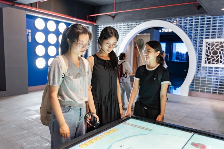 在展覽中心,漁船的繩索互動裝置引起了連續(xù)的驚呼——當(dāng)拉動繩索,背景屏幕同時播放出雄壯的漁家號子,讓人仿佛身臨其境于洶涌波濤中的出海體驗。而石浦方言猜詞游戲則讓成員們捧腹不已,“‘夜飯吃過未’原來是‘晚飯吃了嗎’的意思!”這種“玩中學(xué)”的模式,讓非遺文化真正“活”了起來。