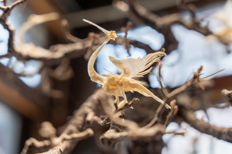 在探訪古城文化的過程中,小分隊遇見象山魚骨造型藝術(shù)代表性傳承人裘亞素并與其展開深度訪談。據(jù)裘亞素介紹,魚骨畫源自漁民將廢棄魚骨轉(zhuǎn)化為祈福裝飾的傳統(tǒng),2021年入選寧波市級非遺名錄。其制作需精選鯔魚、鱸魚等本地魚種的脊椎骨,經(jīng)蒸煮脫脂、自然晾曬后,通過拼接定型形成花鳥、山水等意象。