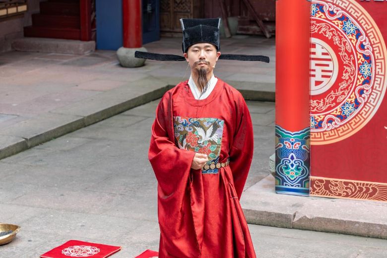 在關(guān)帝廟民俗展廳,團隊觀看了古城特色戲劇——“公雞成親”,該戲劇向游客介紹了象山漁文化的婚嫁習(xí)俗。觀看后團隊在展廳內(nèi)重點對“公雞成親”習(xí)俗進行考察。據(jù)記載,該習(xí)俗起源于明清時期東南沿海漁民“嫁雞隨雞”的婚約信仰——當(dāng)新郎因出海無法歸期,便由小姑懷抱紅布系頸的公雞代行拜堂禮,寓意“宗族延續(xù)不可斷”。