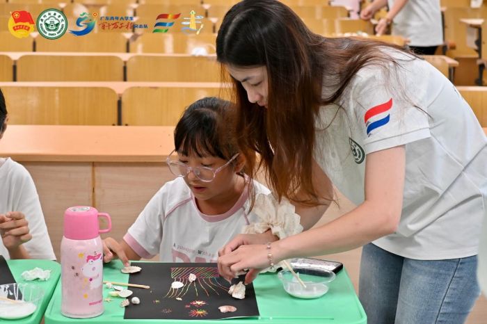 7 月 10 日,南澳縣后宅鎮(zhèn)中心小學(xué)五年級(jí)的教室里,廣州新華學(xué)院 “藝路向汕” 三下鄉(xiāng)實(shí)踐隊(duì)的隊(duì)員們正積極準(zhǔn)備著貝殼裝飾畫的材料。這場(chǎng)以貝殼裝飾畫為主題的美育課,充滿著濃濃的海島文化,借助南澳島豐富的貝殼資源,讓孩子們?cè)谟H近自然的過程中學(xué)習(xí)審美與創(chuàng)作。