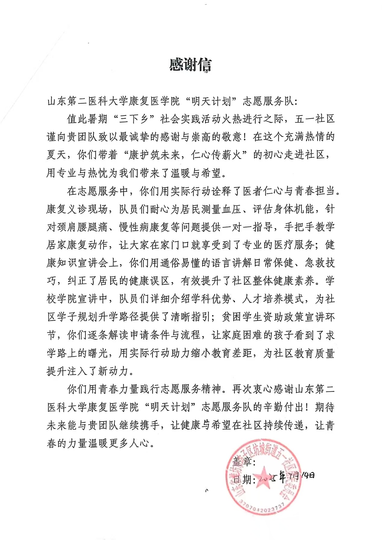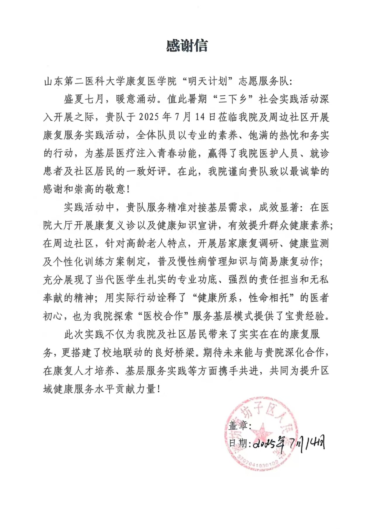 志愿服務隊的熱情付出與專業(yè)表現(xiàn),贏得了坊子區(qū)人民醫(yī)院和五一社區(qū)的一致認可,雙方分別發(fā)來感謝信,對隊員們的責任擔當、服務精神予以高度肯定,信中寫道:“志愿者們充分展現(xiàn)了當代醫(yī)學生扎實的專業(yè)功底、強烈的責任擔當和無私奉獻的精神,用實際行動詮釋了‘健康所系,性命相托’的醫(yī)者初心”。這既是肯定也是激勵,更見證了志愿服務中雙向奔赴的溫暖與力量。