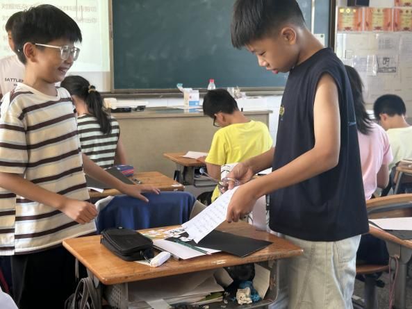 最后的藝術(shù)課程,轉(zhuǎn)向詩(shī)意的沉淀與創(chuàng)造力的迸發(fā)。志愿者以古老而充滿想象力的象山傳說(shuō)故事“為什么魚沒(méi)有腳”為引子,激發(fā)孩子們的想象力;顒(dòng)的高潮“拼貼詩(shī)創(chuàng)作”隨之展開。提前精心準(zhǔn)備的素材鋪陳開來(lái),教室里只剩下窸窣的裁剪聲和認(rèn)真的粘貼聲。一雙雙小手在卡紙上精心布局,“他的悲傷成了星星”“小狗喜歡影子”孩子們的表達(dá)童真中充滿了思考的力量。